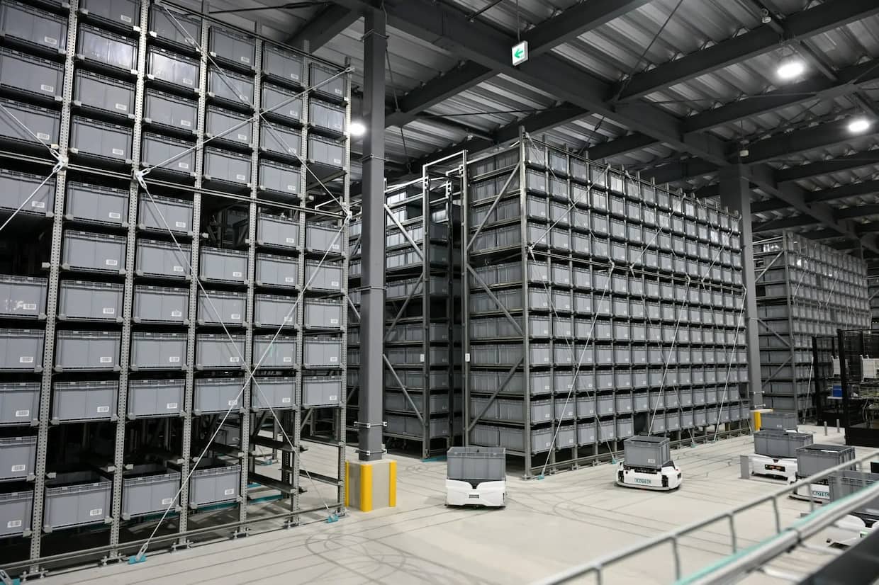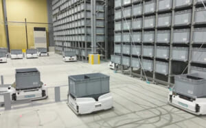 ▲高層ラックと26台の搬送ロボットでシステム構成したSkypod(出所:オークラ輸送機)
