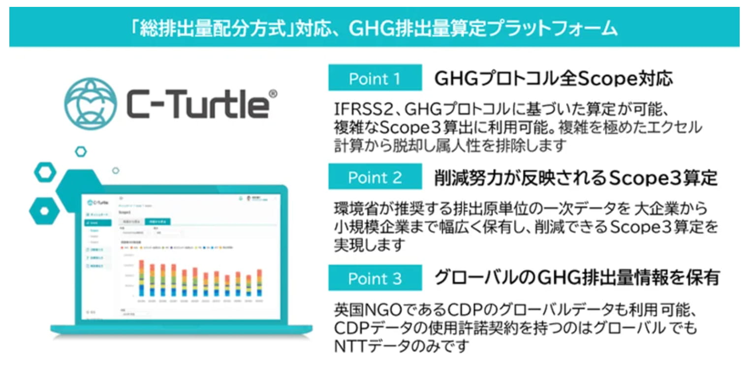 環境・CSRNTTグループでは、NTTデータが提供している企業のCO2排出量を可視化するシステム「C-Turtle」(シータートル)を軸にした脱炭素経営の支援策を始めた。弊社既報の通り、NTTデータとNTT DXパートナーは共に秋田銀行と手を結び、同行の融資先企業にC-Turtleを無償で配り始めたのだ。