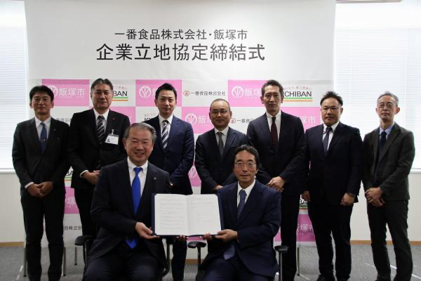 フード福岡県飯塚市は7日、6日に一番食品(飯塚市)と新工場建設に関する企業立地協定を締結したと発表した。新工場は同市鯰田の栗尾工業団地内(敷地面積2万4398平方メートル)に建設される。市役所で行われた締結式には、一番食品の有吉崇社長と武井政一市長が出席し、協定書を取り交わした。