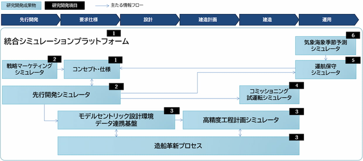 同プラットフォームでは、初期の開発、設計段階で、建造、運用のライフサイクルとサプライチェーンを同時並行的に考慮して、高性能次世代船舶の仕様や建造計画を最適化する。船舶の安全な運用に影響を与える気象・海象の予測についても、台風などの極端現象を含めて1-3か月先まで予測できる技術を確立し、プラットフォームに組み込む。