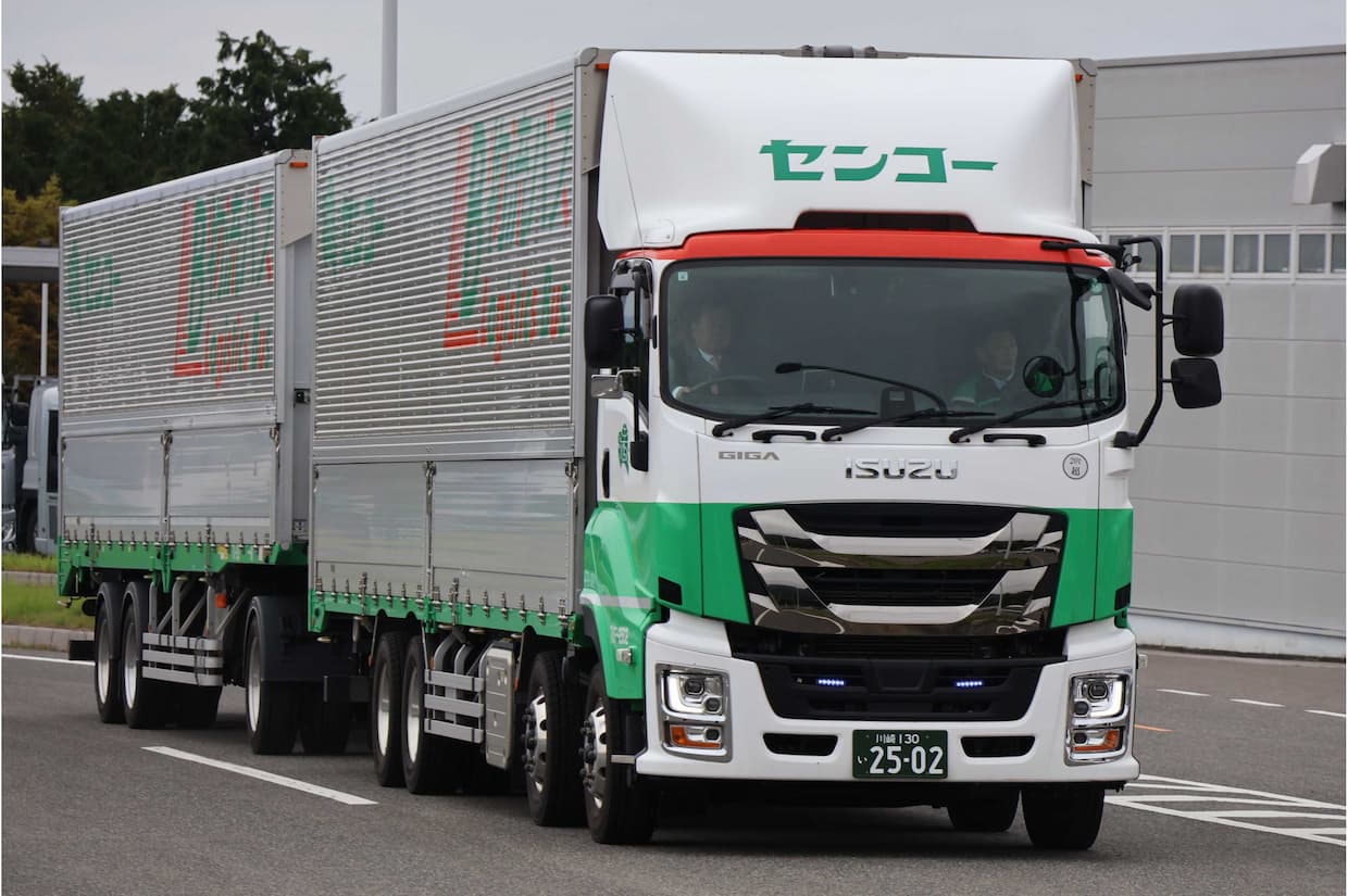 ▲社長の福田泰久氏によるダブル連結トラックのデモ走行(出所:センコーグループホールディングス)