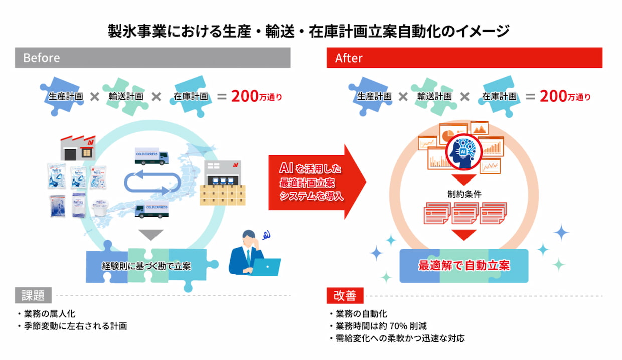 フードニチレイは15日、ニチレイフーズグループのニチレイ・アイス(東京都中央区)が、生産・輸送・在庫計画の立案業務を自動化するAI(人工知能)システムを導入したと発表した。日立製作所と協創で開発したもので、包装氷の需要変動に対応しながら計画立案にかかる時間を従来比で70%削減。熟練担当者のノウハウを取り込み、属人化していた業務を効率化することで、生産・物流現場の負荷軽減と安定供給体制の強化を図る。