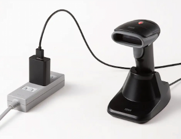 ▲置くだけで充電できるクレードル付きの2次元バーコードリーダー「BCR-BT2D15」(出所:サンワサプライ).