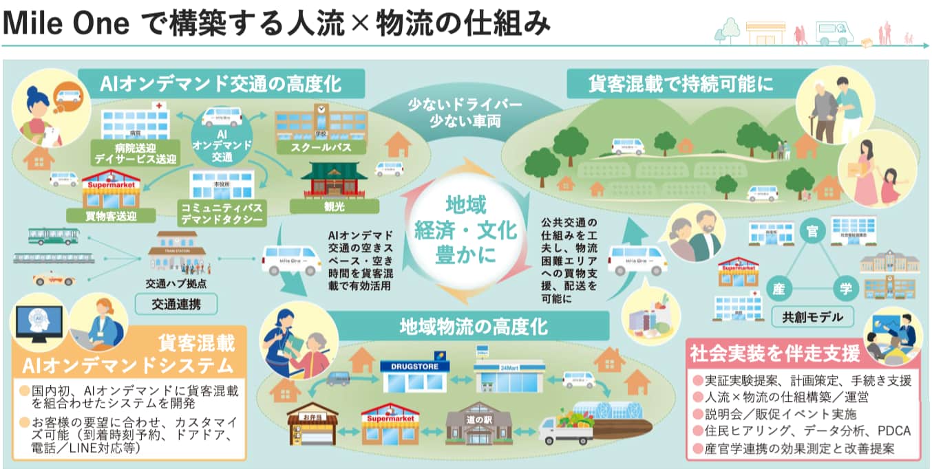ロジスティクスセイノーホールディングス(HD)、住友商事、大新東(東京都江東区)、REA(中央区)の4社は1日、山口県下関市豊田町で、AI(人工知能)オンデマンドシステムと貨客混載を組み合わせた地域モビリティーサービス「Mile One」(マイルワン)の実証実験を開始した。産官学連携による同様の取り組みは国内初。国土交通省の「共創モデル実証運行事業」に採択され、2026年3月31日までの6か月間実施する。