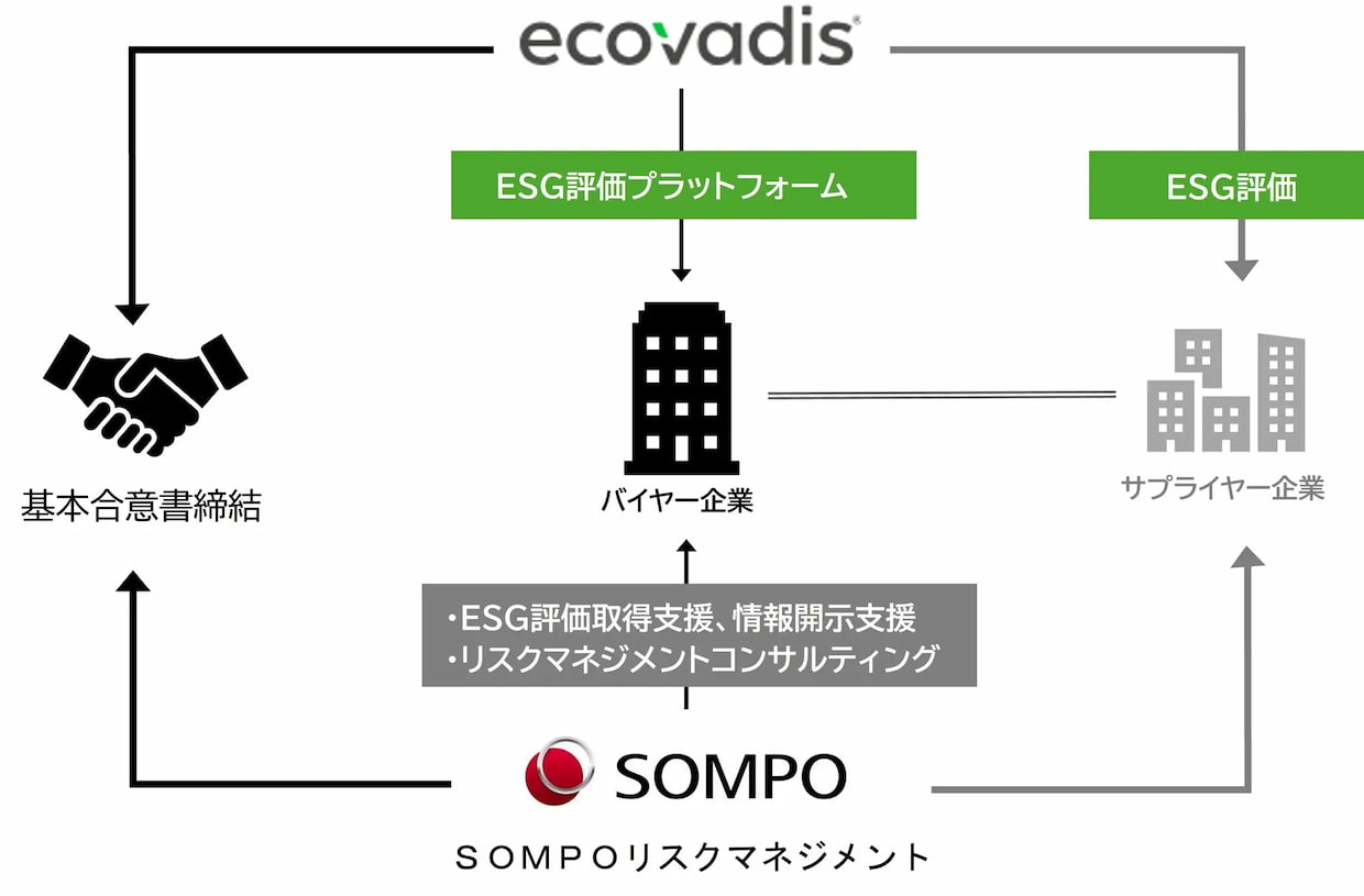EcoVadisは全世界で15万社以上のサプライヤーを評価しており、そのスコアはバイヤーのESGリスク評価に利用されている。SOMPOリスクマネジメントはこれまでにPanoraysやリスクスコアリング、事業継続(BCP)や防災・減災支援などのサービスを提供しており、今回の協業ではEcoVadisの外部評価に基づく課題に対し改善支援を行う。