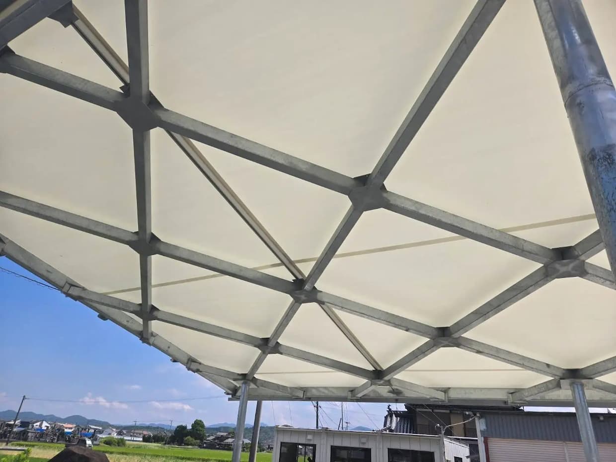 TensoDiaRoofは、格子状に剛接合された鉄骨母屋に光を透過する膜材を張った構造で、鉄骨量を10%削減しながら強度を確保。九州第一工業の鉄骨技術をベースに、日本建築センターの評定も取得している。また太陽工業は、新たな膜定着金物を導入することで、デザインの自由度と支持点の調整性を向上させた。