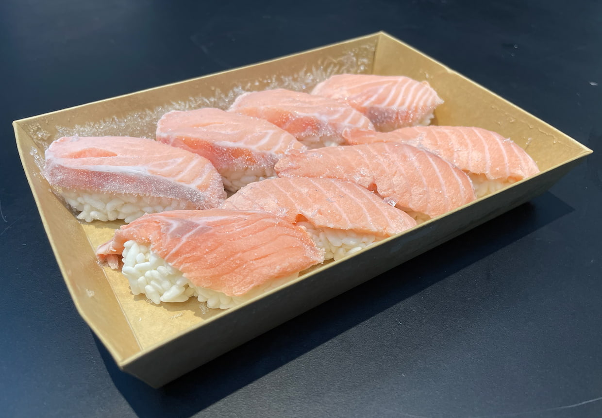 ▲冷凍寿司。冷蔵解凍、常温解凍で出来たての味を再現できる