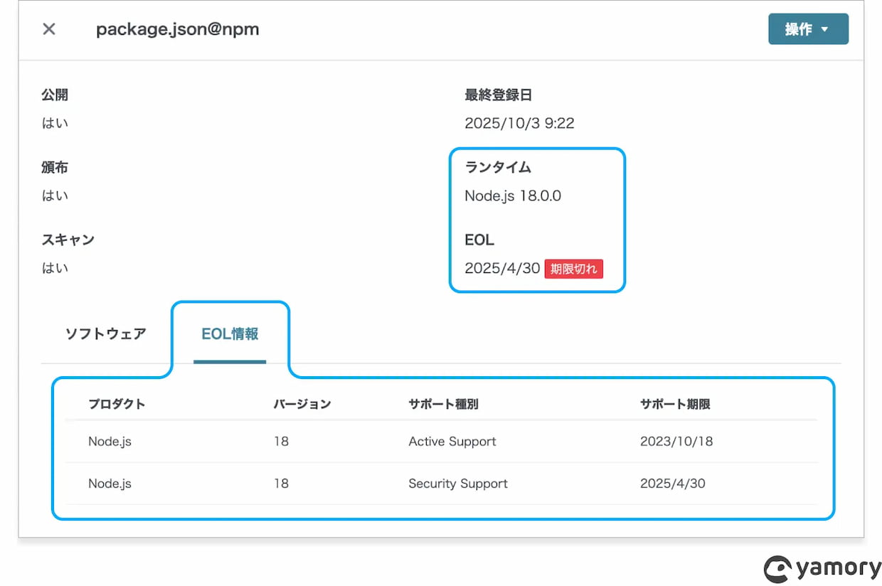 サービス・商品Visional(ビジョナル、東京都渋谷区)は27日、グループ会社のアシュアード(同)が運営する脆弱性管理クラウド「yamory」(ヤモリー)で、アプリケーション開発者が主体となってランタイムのEOL(End Of Life)管理を行える新機能の提供を開始したと発表した。