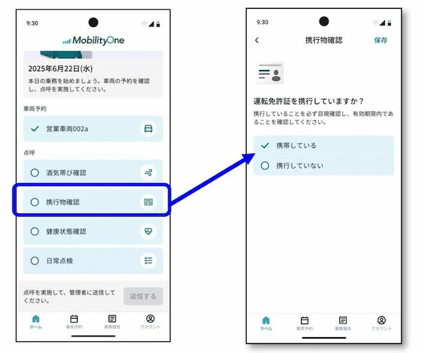 今回の更新では、従来の「酒気帯び確認」と「日常点検」に加え、ドライバーの「健康状態確認」と運転免許証の「携行物確認」を新たに追加。これにより安全運転管理者が運転者の状態を多角的に把握できるようになった。