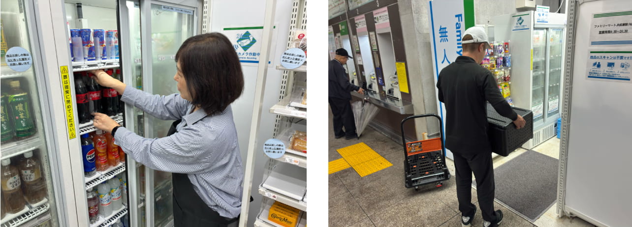 ▲JR横浜線成瀬駅の無人店での陳列(左)と運搬(右)の様子(出所:セイノーHD)