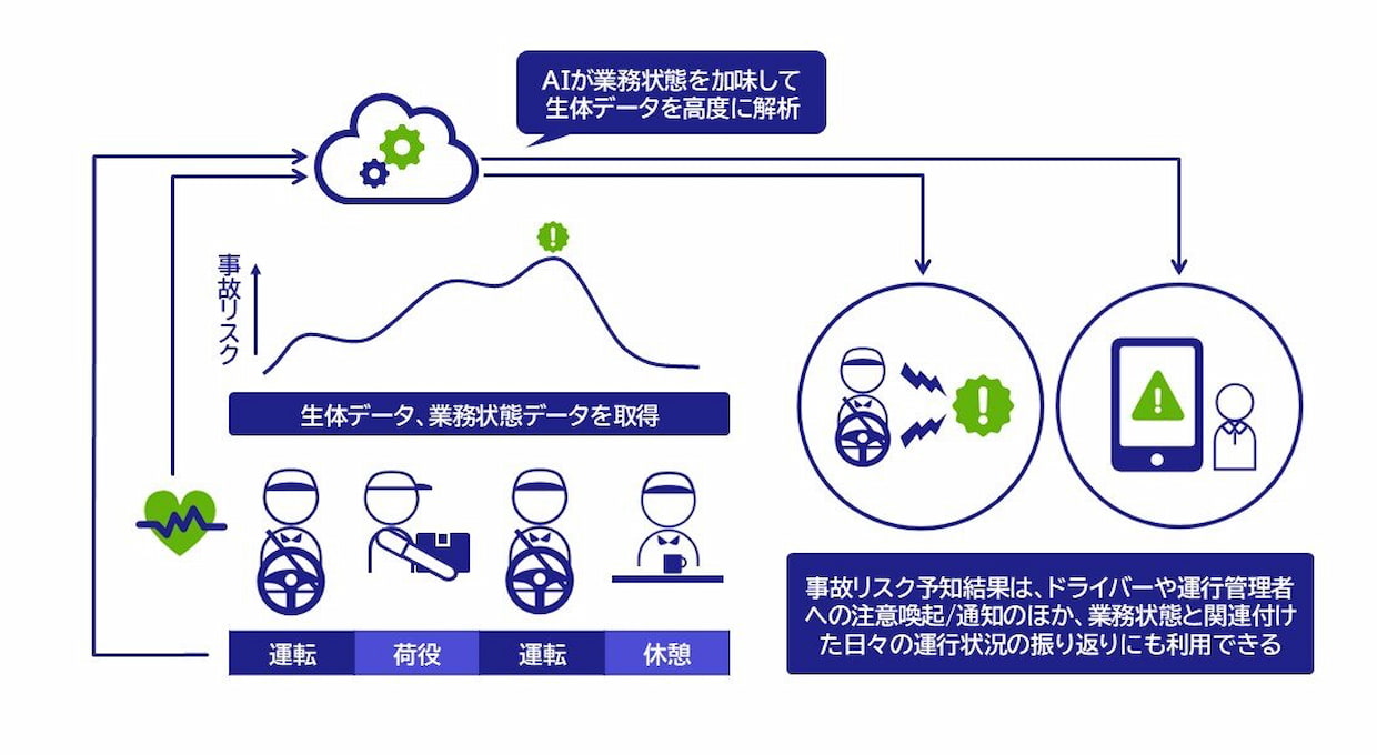 同システムは、ドライバーの生体データを解析し、業務状況に応じた事故リスクを高精度に予測する仕組み。トラックやバス、鉄道など多様な運転業務に応用できるのが特徴だ。自律神経などのバイタルデータを荷積みや休憩など運転以外の業務状態と関連付けて解析し、疲労やストレスによるリスクを早期に検知。運転者自身が気づきにくい体調変化を把握し、事前にアラートを発して事故の未然防止を図る。