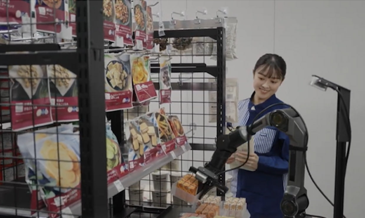 もう1台はアームを搭載し、棚への商品補充を行う品出し作業を自動化する。画像と音声指示を組み合わせたVLA(Vision-Language-Action)モデルを用い、店舗業務を事前に学習。人の手のような動きを再現できる5指ハンドモデルも採用し、お菓子やインスタント食品などの繊細な品出しを再現する。作業時には取り出した商品の種別と数量を自動記録し、バックルームの在庫把握にも活用する。