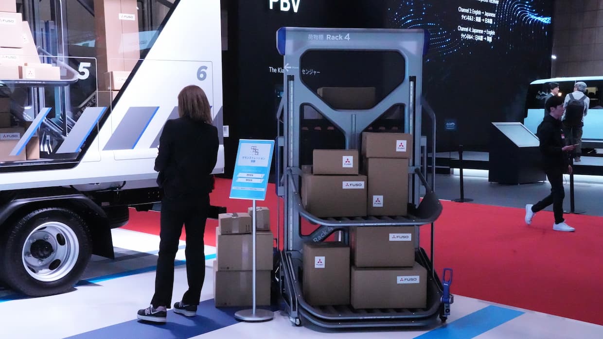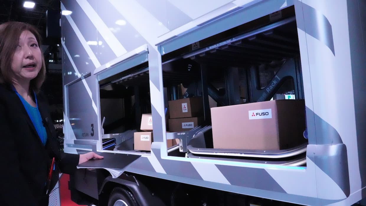 同社ブースのテーマは「Future Together」。デッペン社長は「顧客、ドライバー、社会とともに未来を創る」と述べ、既存の電動小型トラック「eキャンター」に加え、新しいデジタルソリューション「COBODI」(コボディ)を世界初披露した。「COBODI」は、積載効率や配送ルートを自動最適化するスマート車体システムで、積み降ろし時間の短縮とドライバー負担の軽減を図るという。積み込みの際には配送順に専用ラックに荷物を積みつけ、配送先ではドライバーがタブレットを操作すると荷室横の窓から必要な荷物を取り出すことができるというもの。