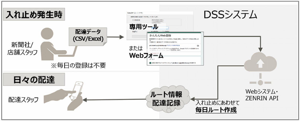 西日本新聞プロダクツは新聞販売店の抱える課題を解決し、業務の効率化を図るため、西日本新聞読者管理祖ステムを構築し、新聞購読料の自動振替や、購読に関する受付事務の集中管理化などを進めている。DSSは、中核を担う最新システムで、配達先への道順をスマホ上で案内したり、全体の配達経路をマップにして表示したりできる。また、事務所のパソコンから、配達中の現在地を確認することもできる。