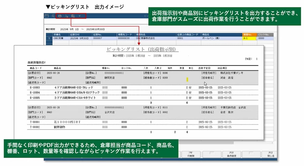 受注時には在庫状況を自動参照し、将来の在庫を考慮した引当が可能となるほか、ピッキングリストやロケーションリストを活用して倉庫での作業を円滑化する。さらに、欠品リストや過剰在庫リスト、トレーサビリティーレポートなど、多様な帳票を通じて在庫の動きを可視化できる。