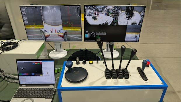 開発したシステムは、既存のフォークリフトにセンサーやカメラ、アクチュエーターを後付けして遠隔操作を実現するもので、専用操作卓からカメラ映像やセンサー情報を確認しながら走行・荷役作業を行う仕組み。人が搭乗せずに作業できる“実質的な無人化”を目指す。操作支援には日立製作所開発のARアプリを活用し、貨物との位置関係などを映像上に重ねて表示することで、直感的な操作性と安全性を確保する。