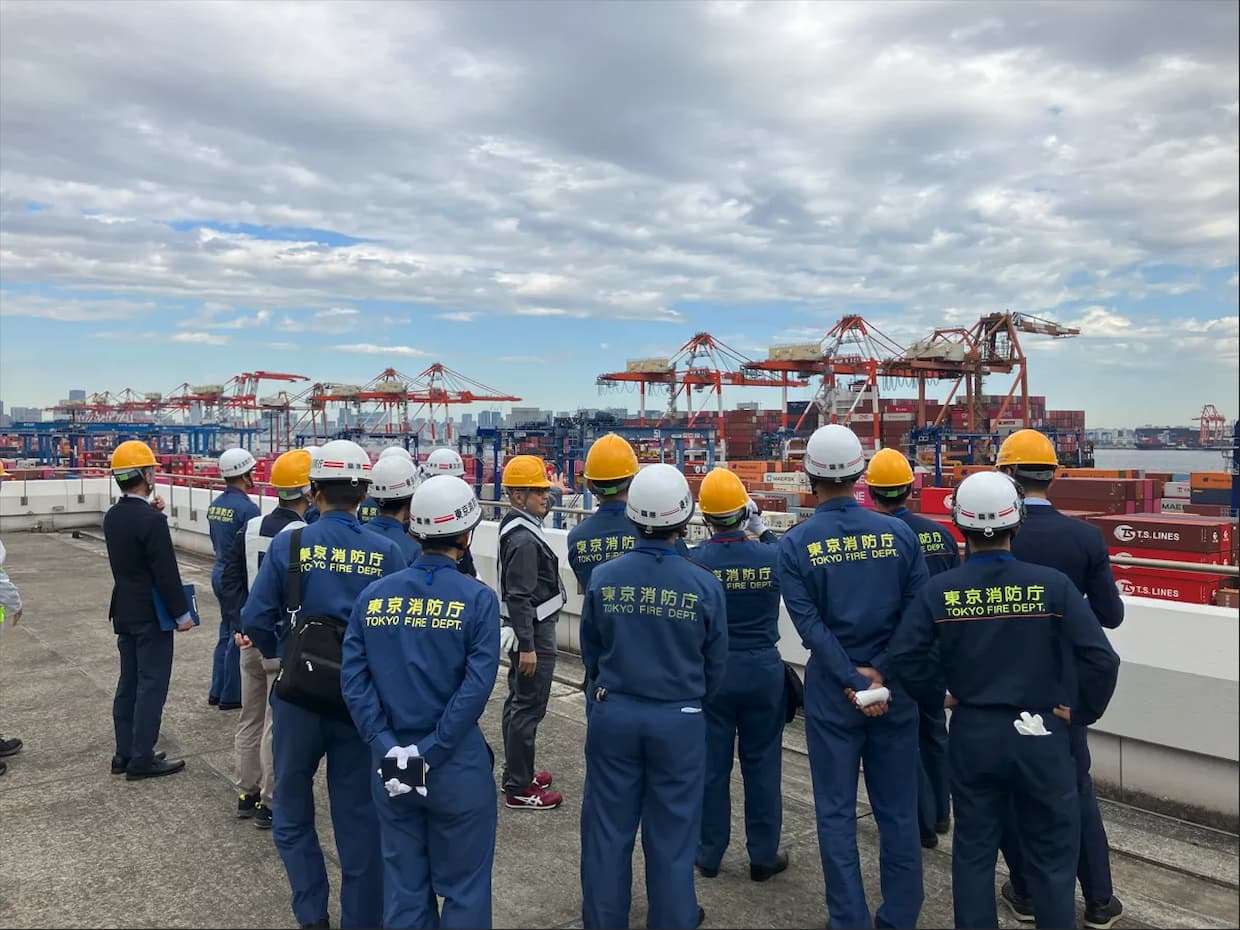 また、停泊中のコンテナ船上では、乗組員と海技者が協力し、各種消火設備や設置場所を確認。設備の操作方法や船陸間連携の重要性について意見交換を行った。