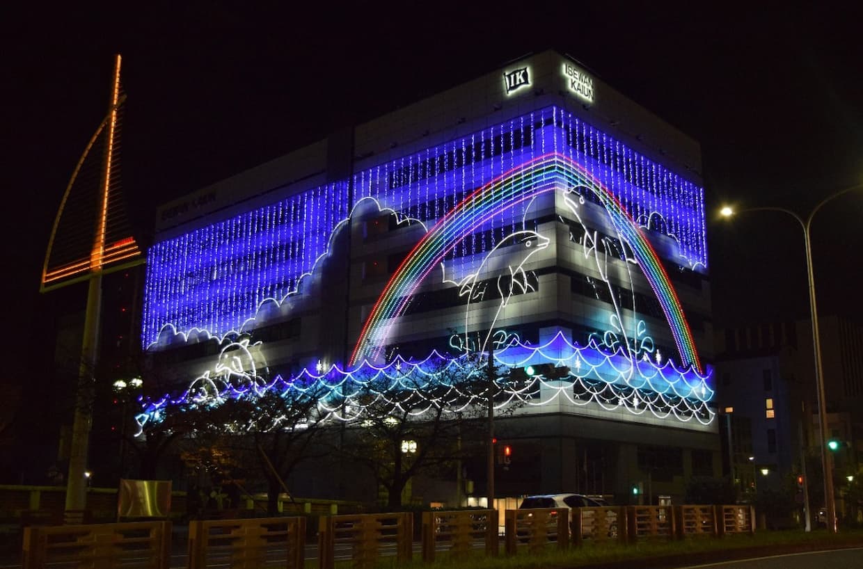 イルミネーションは名古屋市営地下鉄名古屋港駅2番出口付近の本社ビル本館(西面・北面)と別館(北面)に設置。深い青色の光で空と海を表現し、イルカのモチーフが来訪者を迎える構成とした。7色の虹は、国際総合物流を展開する同グループが掲げる「国と国、世界をつなぐ」理念とダイバーシティを象徴する。
