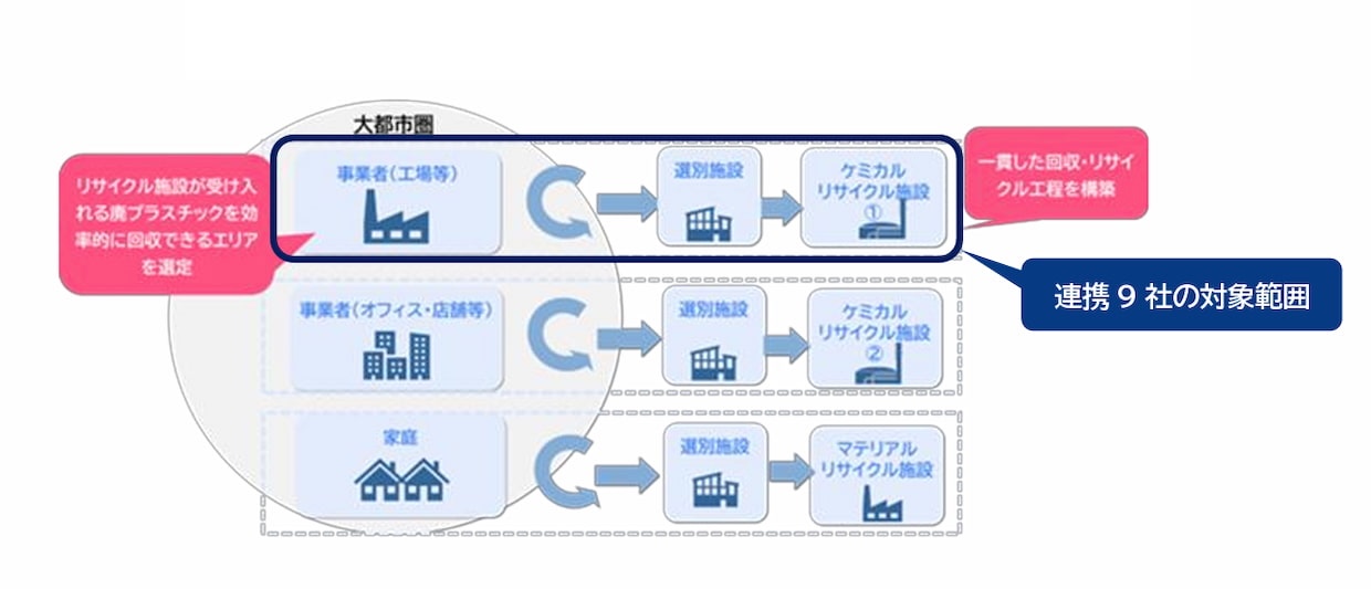 9社による実証を通じて、大量のプラスチックが廃棄される大都市圏で効率的な回収、再資源化が可能となるモデルの構築を目指す。