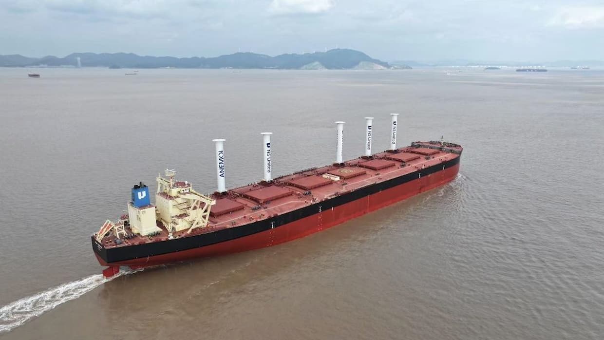 ロジスティクスNSユナイテッド海運(NSU)は6日、ヴァーレ・インターナショナル(スイス)との鉱石輸送契約に従事する40万トン型鉱石船「NSU TUBARAO」に、アネモイ・マリン・テクノロジーズ(英国)製のローターセイル5基と軸発電機を10月29日に搭載したと発表した。