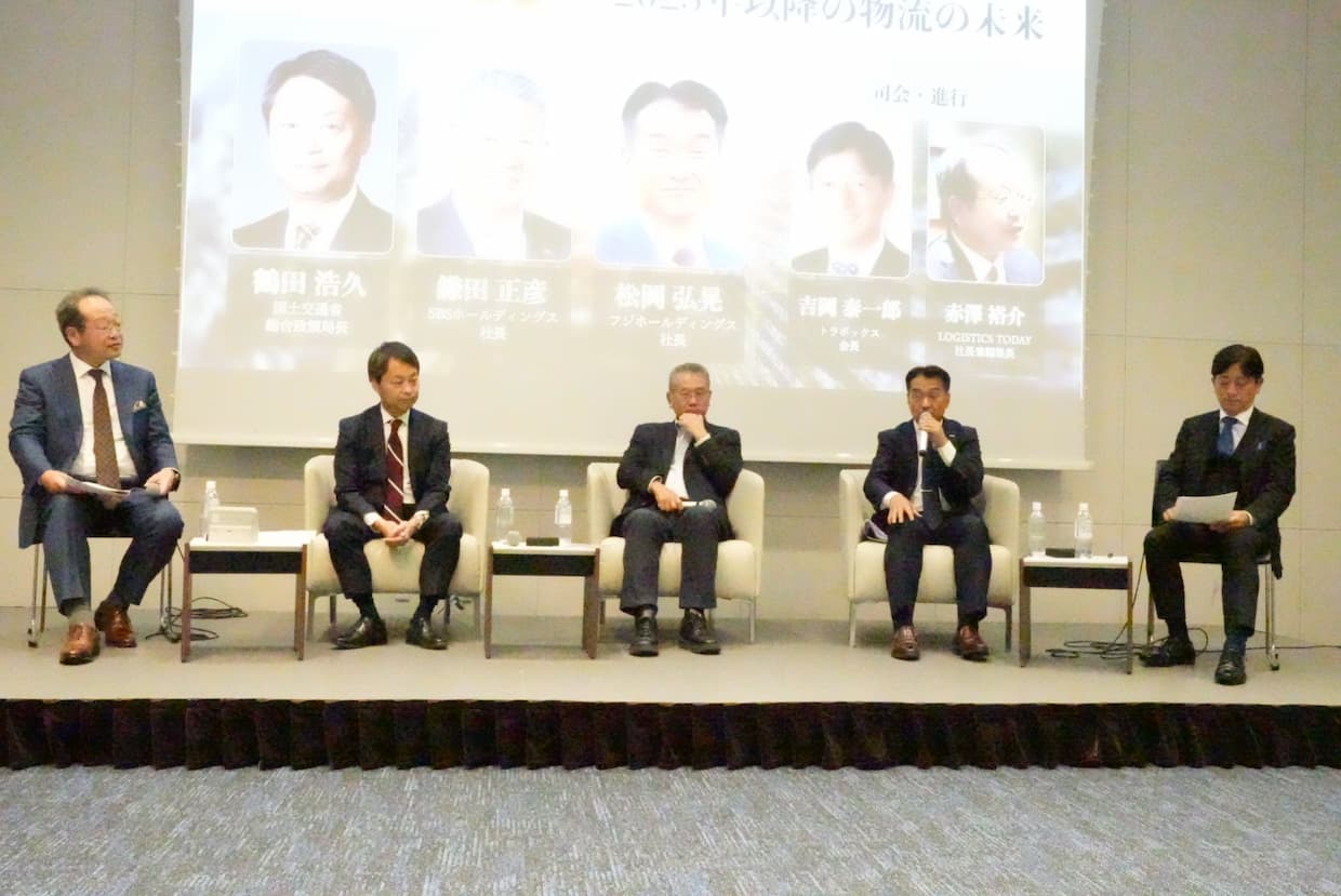 イベント7日開催のLOGISTICS TODAY主催イベント「LOGI NEXT 25 Day1」のクロージングセッションでは、国土交通省総合政策局長の鶴田浩久氏、SBSホールディングス社長の鎌田正彦氏、フジホールディングス社長の松岡弘晃氏が登壇し、「成立したトラック新法と2025年以降の物流の未来」をテーマに議論を展開した。モデレーターはトラボックス会長の吉岡泰一郎氏、LOGISTICS TODAYの赤澤裕介・社長兼編集長が務めた。