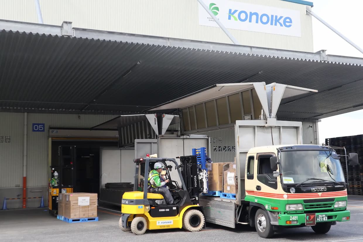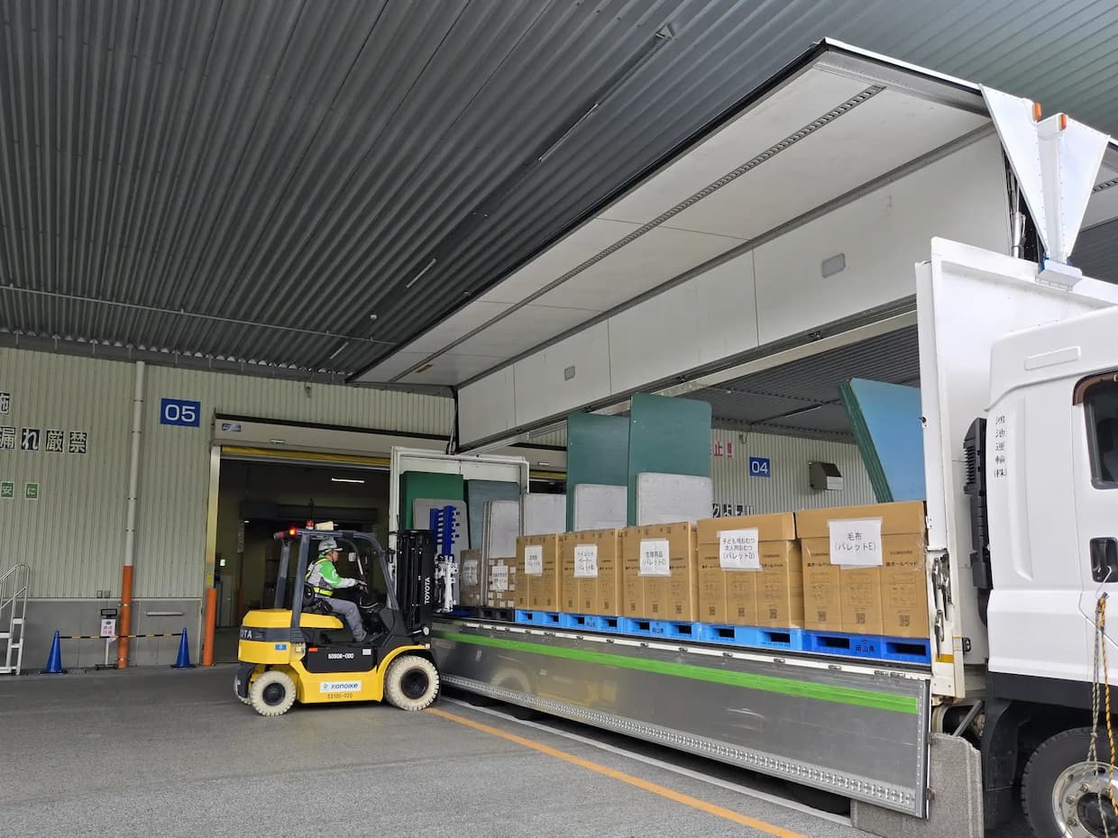 ▲プッシュ型支援物資を、真庭配送センターに受け入れる様子(出所:鴻池運輸)