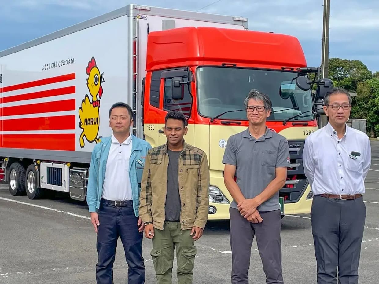 ▲マルイ運輸の社員とインド人トラックドライバー第一号のラケッシュ(出所:NAVIS)