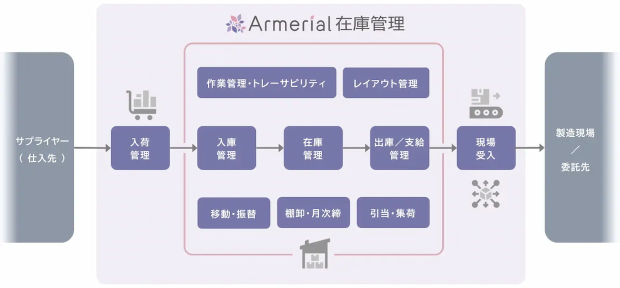 Armerialには「Armerial購買管理」「Armerial在庫管理」の2つの機能があり、 購買業務と在庫管理業務の自動化や標準化を進める。購買管理では、見積もり依頼から発注、検収までの一連の業務を統合的に管理し、直接材や一般購買、外注委託品、支給品など多様な品目に対応する。また、サプライヤー(調達先企業)との「購買Web-EDI」も提供し、煩雑だったやりとりを一元化し、業務の省力化と効率化を図る。
