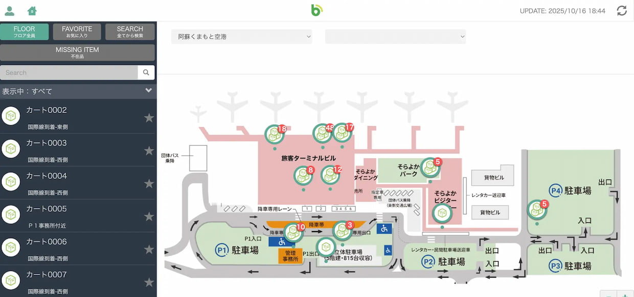 導入では200台のカートにビーコンを取り付け、空港内の各置き場付近に受信機を設置。保安室のモニターでカート配置をリアルタイムに把握できるようにした。