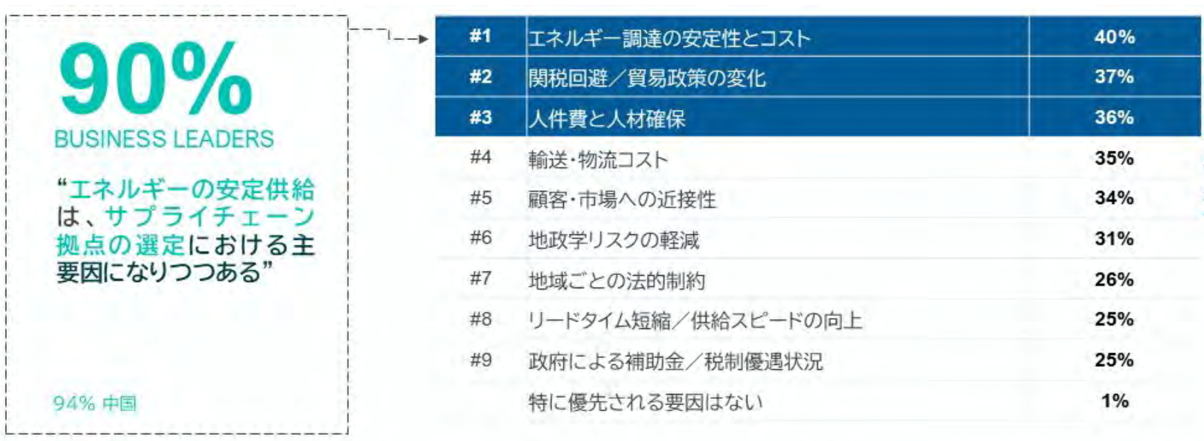 レポートによると、サプライチェーンの拠点選定における意思決定要因として、「エネルギー調達の安定性とコスト」を挙げた回答が40%でトップとなった。これは、従来の定石であった「人件費と人材確保」(36%)や「関税回避」(37%)を上回る結果だ。背景には、90%の企業が「信頼性の高いエネルギーインフラには追加コストを支払っても構わない」と回答するなど、電力供給に対する強い危機感がある。