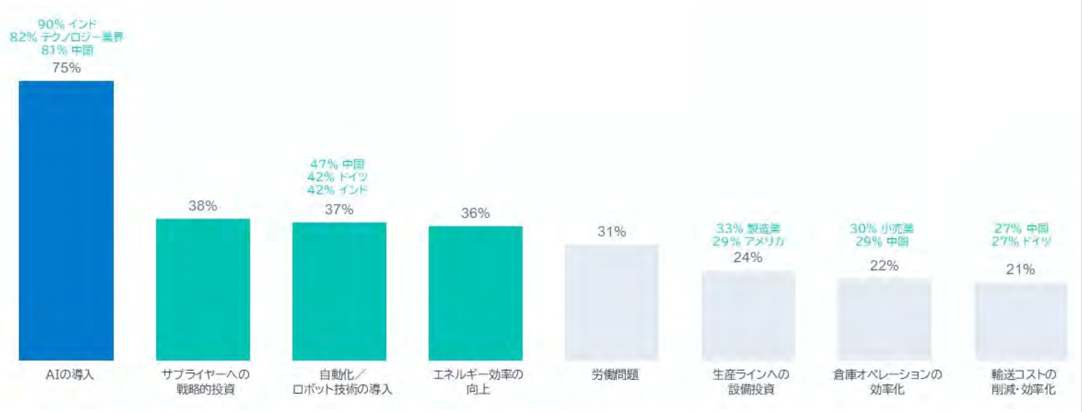 この地殻変動の「震源地」は、企業の間で加速するAI投資だ。26年に向けた最優先の資本投資先として、75%の企業が「AIの導入」と回答しており、「自動化・ロボット」(37%)を大きく引き離した。