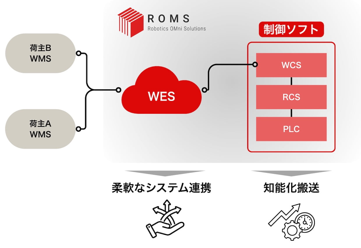 物流や製造の現場では、既存のMES(製造実行システム)やWMSといった上位システムとのシームレスな連携が欠かせない。ROMSの自動倉庫は、自社開発のWESを介して、この点でも高い柔軟性を備えている。