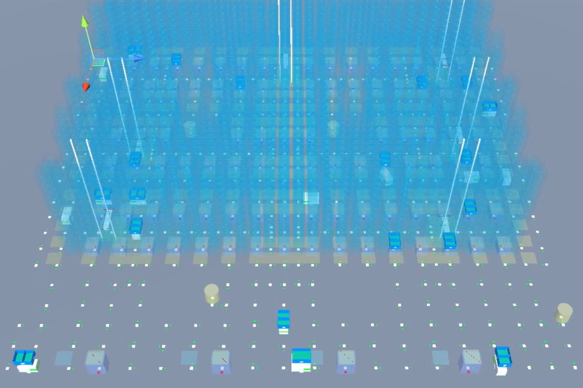 この制御ソフトは、単に機器を動かすためのものだけではない。スタッカークレーン、AGV(無人搬送車)、コンベヤー、ロボットといった異なる機器をシームレスに連携させ、最少の動きで最大の処理能力を発揮する。出庫指示を受けると搬送コンテナの割り付けや搬送順、ルートをリアルタイムで最適化し、複数の出荷明細を同時に効率よくピッキングできるよう、かつ、最少の搬送回数でそれが実現できるように機器を制御している。