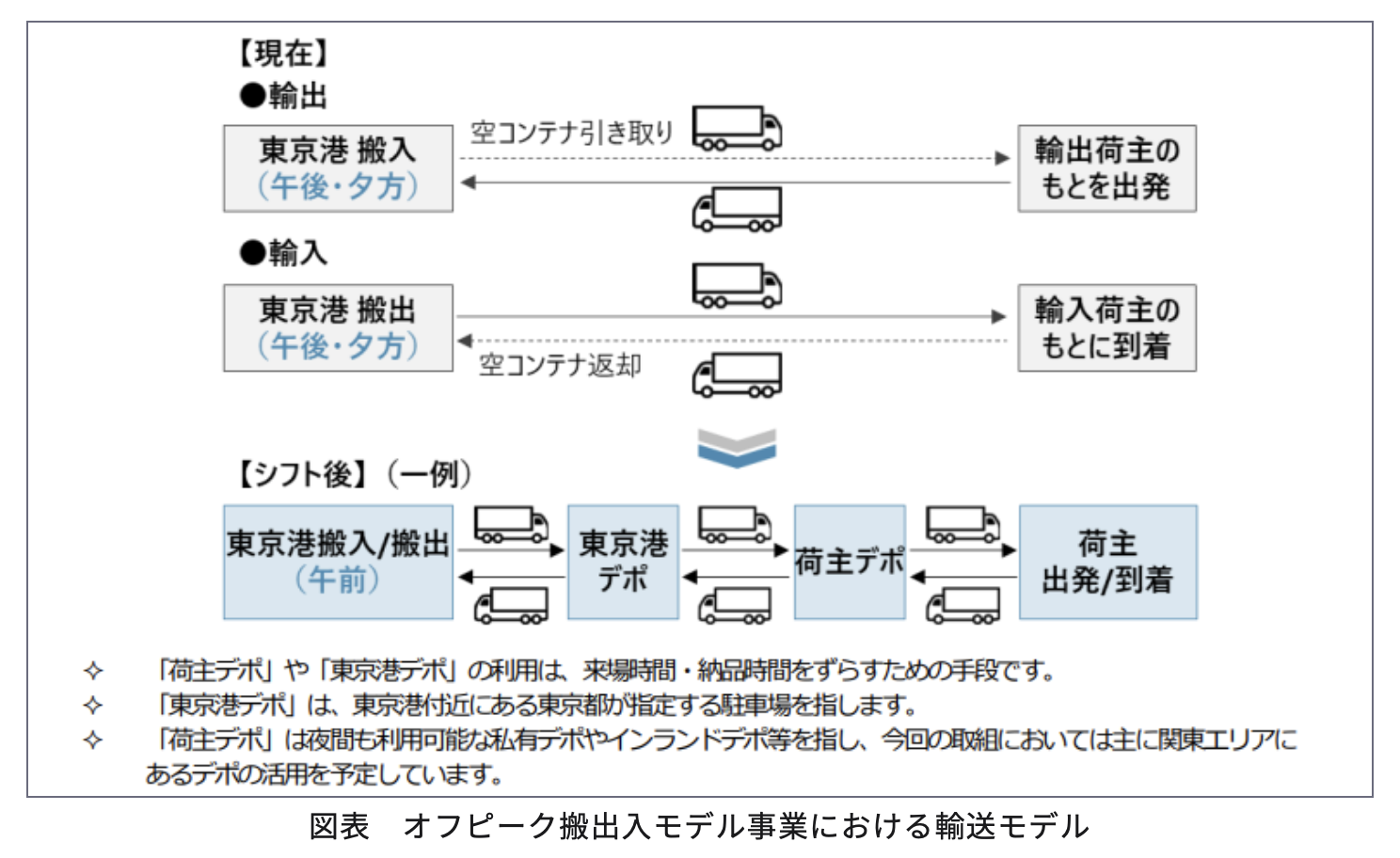 具体的な取り組みにおいては、コンテナヤード近くに東京港デポを中継輸送拠点として用意。夜間の交通量が少ない時間帯に内陸デポと東京港デポ間でコンテナをあらかじめ輸送し、午前中のオフピーク時間帯にコンテナヤードと東京港デポ間の搬出入輸送モデルを構築。これによってどれだけ港湾ゲート前の滞留を抑制し、車両待機時間の短縮や輸送効率の向上につながるかが検証された。