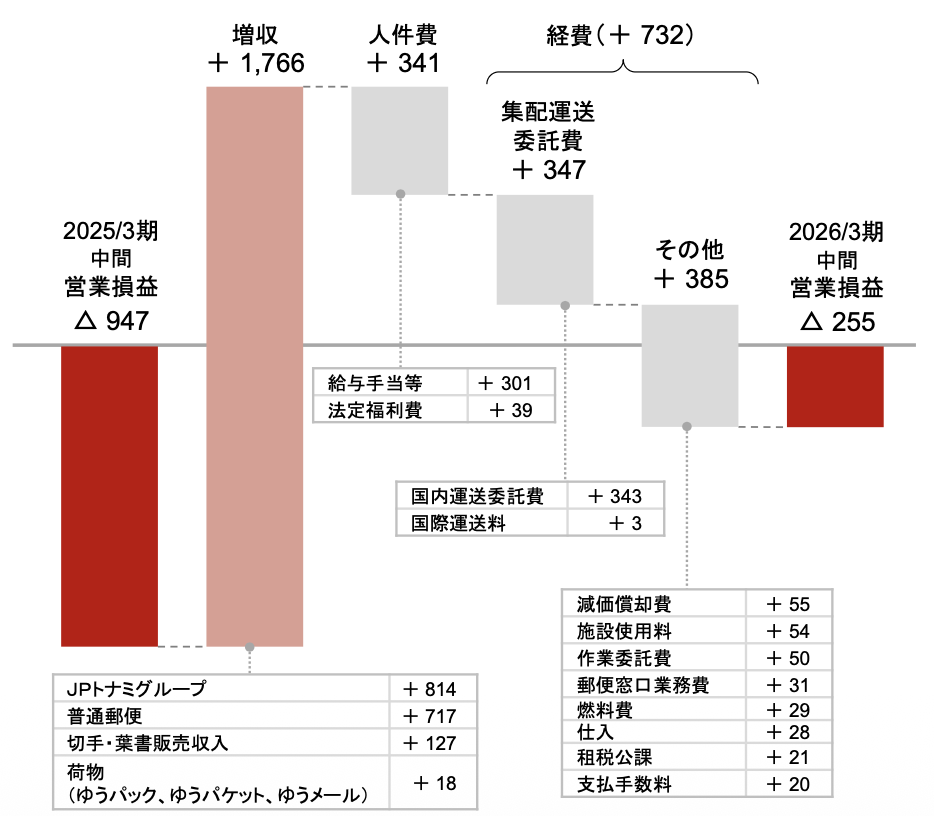 中間期の連結経営成績は、経常収益が前年同期比3.1%増の5兆6824億円、経常利益が同12.6%増の5216億円と増収増益を確保した。しかし、詳細を見ると物流事業の構造的な厳しさが浮き彫りとなる。郵便・物流事業セグメントの営業損益は255億円の赤字だった。前年同期の947億円の赤字からは改善したが、郵便料金改定による単価上昇やJPトナミグループの子会社化などの増収効果(プラス1766億円)を、営業費用の増加(プラス1074億円)が大きく相殺した形だ。