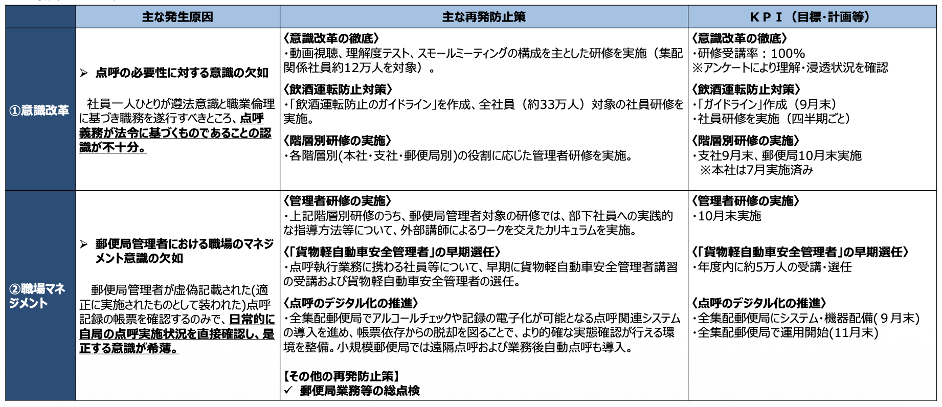 ▲点呼業務の不備事案の再発防止策等の報告(出所:日本郵便)