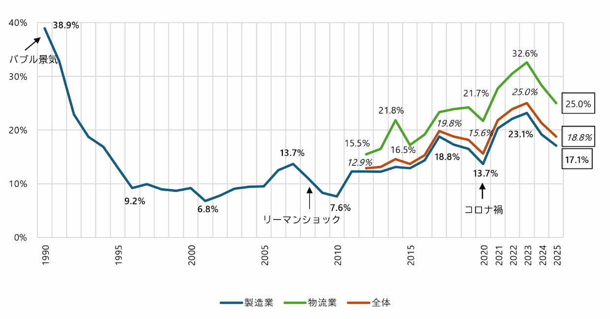 さらに、産業用地の取得に難航する企業が増えており、特に物流業では「用地価格の上昇」「候補地域に用地がない」「土地利用規制(農地転用・開発許可等)」が主な理由として挙がっている。