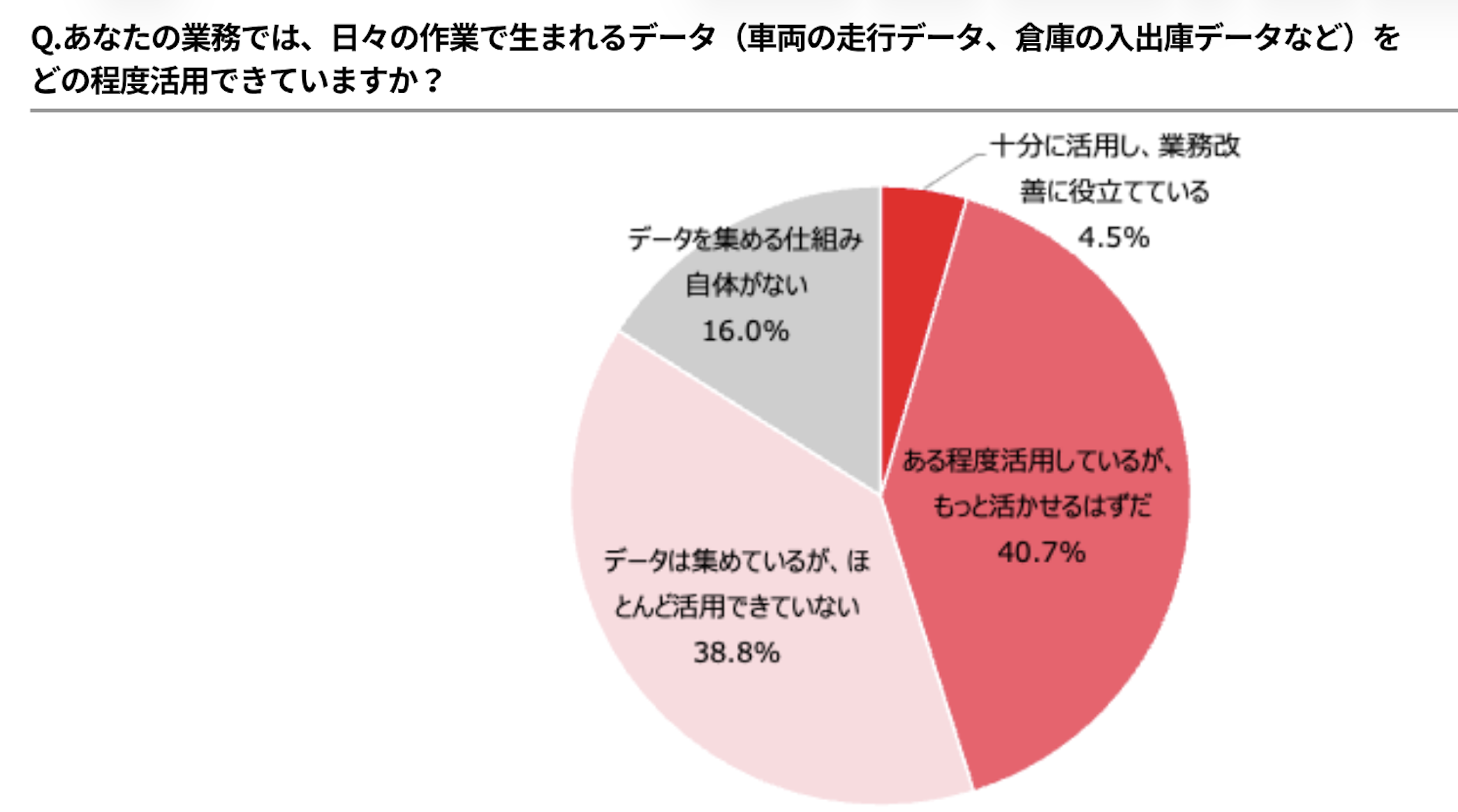 AI活用の基盤となる「データ」の取り扱いに関しても課題が浮き彫りとなった。車両の走行データや倉庫の入出庫データなどについて、97%以上が「業務改善に活用することが重要」と認識している。しかし、実際の活用状況については「ある程度活用しているが、もっと活かせるはずだ」(40.7%)、「データは集めているが、ほとんど活用できていない」(38.8%)との回答が大多数を占めた。