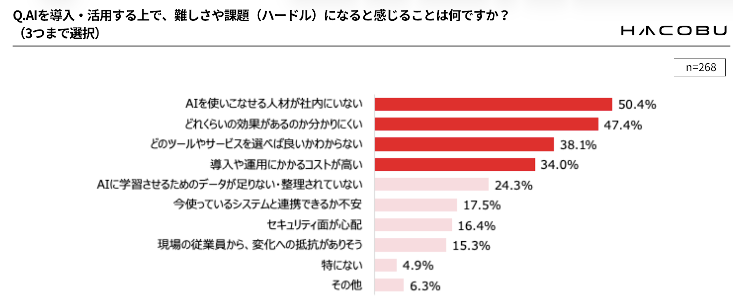 高い意欲がありながら導入が進まない要因として、最も多くの回答を集めたのは「AIを使いこなせる人材が社内にいない」で50.4%に上った。次いで「どれくらいの効果があるのか分かりにくい」が47.4%、「どのツールやサービスを選べば良いかわからない」が38.1%と続く。