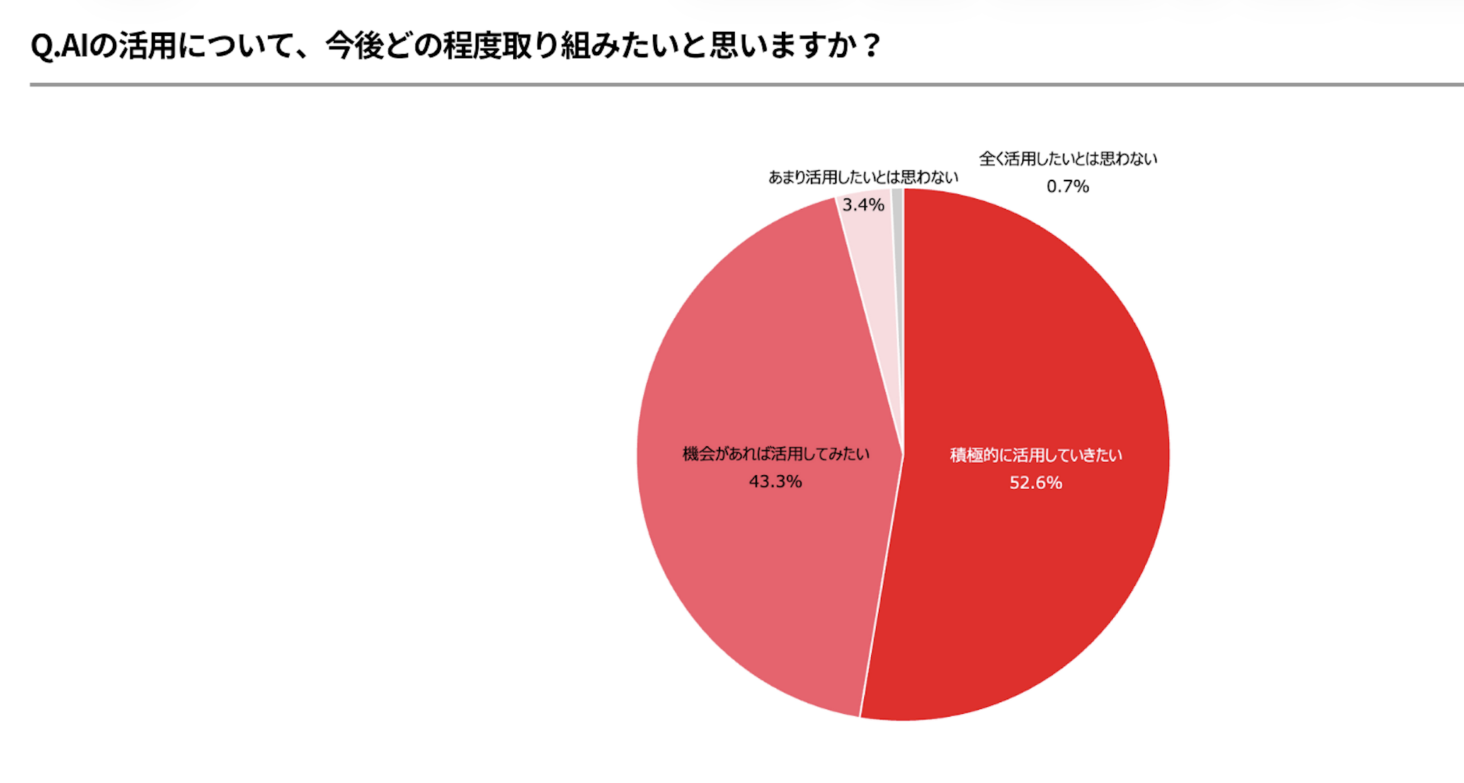 対照的に、今後の活用意向については「積極的に活用していきたい」が52.6%、「機会があれば活用してみたい」が43.3%に達した。合計95.9%の回答者がAI活用に前向きな姿勢を示しており、現状の導入率との間には60ポイントもの大きな乖離(かいり)が存在する。物流業界全体がAIの必要性を強く認識しながらも、実際の導入には足踏みしている現状が明らかだ。