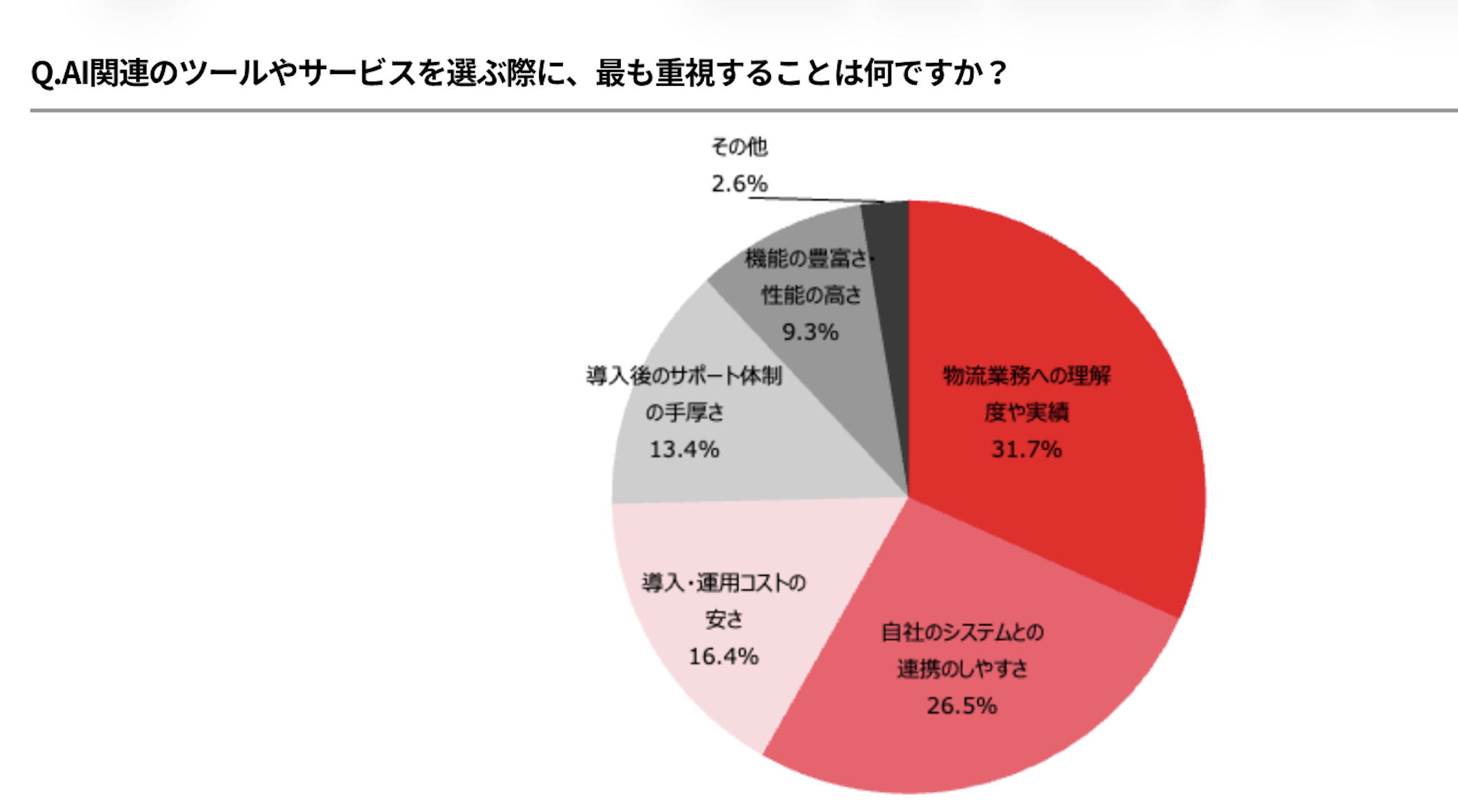 また、ツール選定時に重視する点として「物流業務への理解度や実績」が31.7%で最も多く挙げられた。汎用的なAIツールではなく、物流特有の商慣習や現場のオペレーションを深く理解したベンダーやパートナーが求められている。