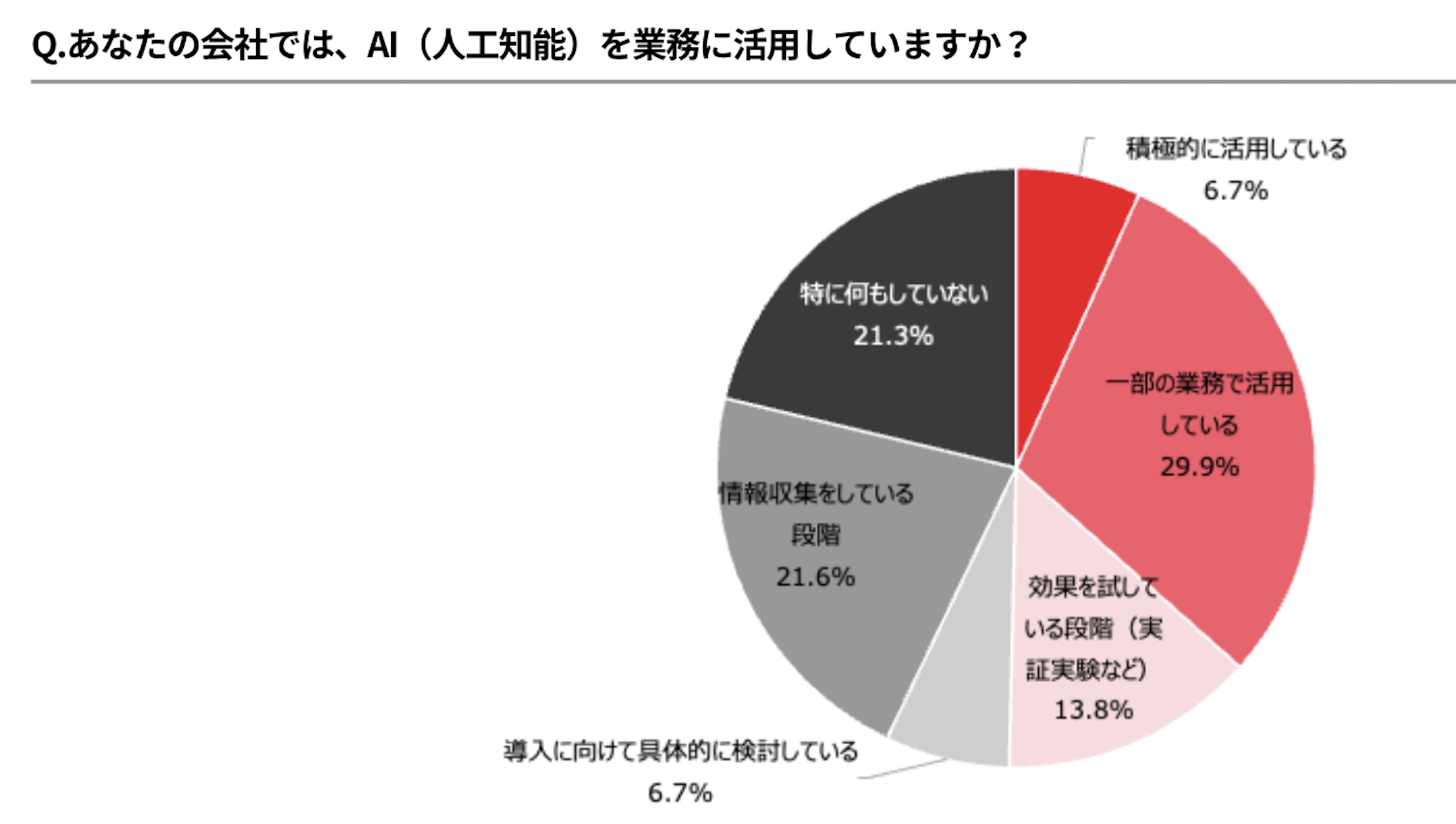 調査結果によると、AIを業務に「積極的に活用している」との回答は6.7%、「一部の業務で活用している」は29.9%だった。これらを合計したAI導入率は36.6%にとどまり、依然として過半数が「特に何もしていない」または「情報収集段階」にあるのが現状だ。