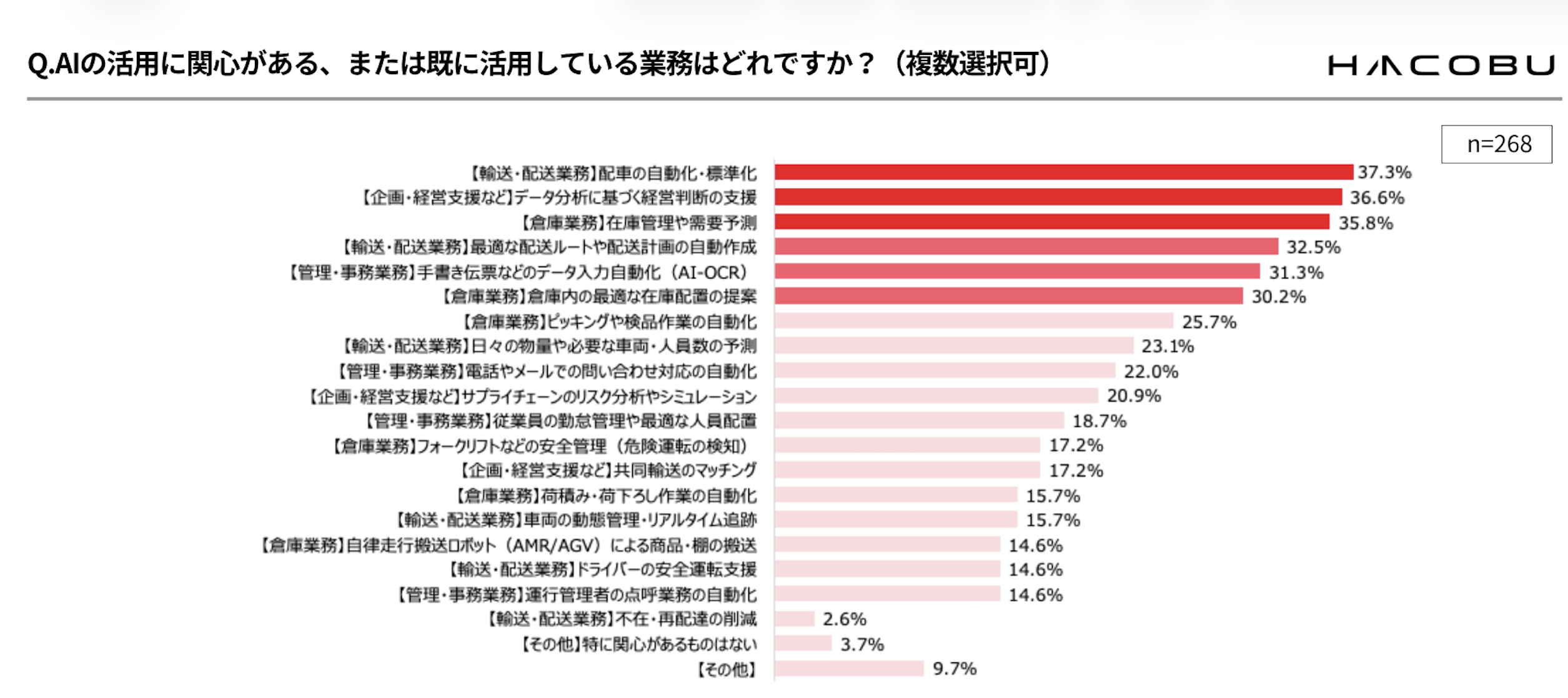 AIを活用したい、または関心がある業務領域としては、「配車の自動化・標準化」が37.3%で最多となった。ベテラン配車係の経験と勘に依存してきた配車業務をAIで自動化し、属人化の解消と効率化を図りたいというニーズは根強い。