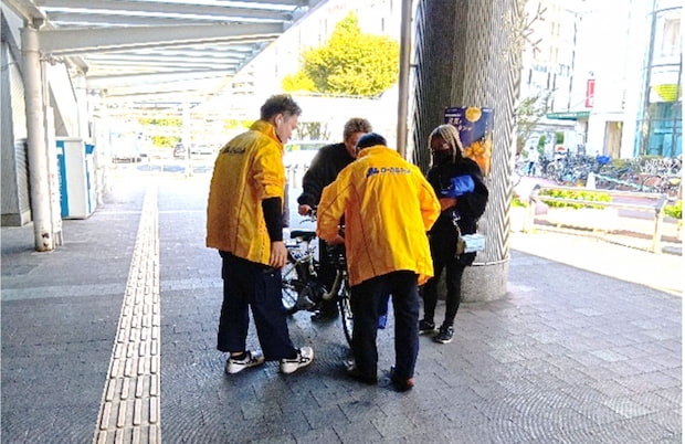 取り組みは、同連合会の設立認可月である11月を「ローカル月間」と定め、毎年実施している地域貢献活動の一環であり、ことしは近畿地域本部の有志15人が参加した。午前の活動開始にあたって巽冨美男本部長が挨拶を行い、その後、駅前で通行人に呼び掛けながら防犯対策の前かごカバーを配布。受け取った利用者にはその場で取り付け方法を説明した。用意した200枚は、1時間足らずで配布を完了する盛況ぶりだった。