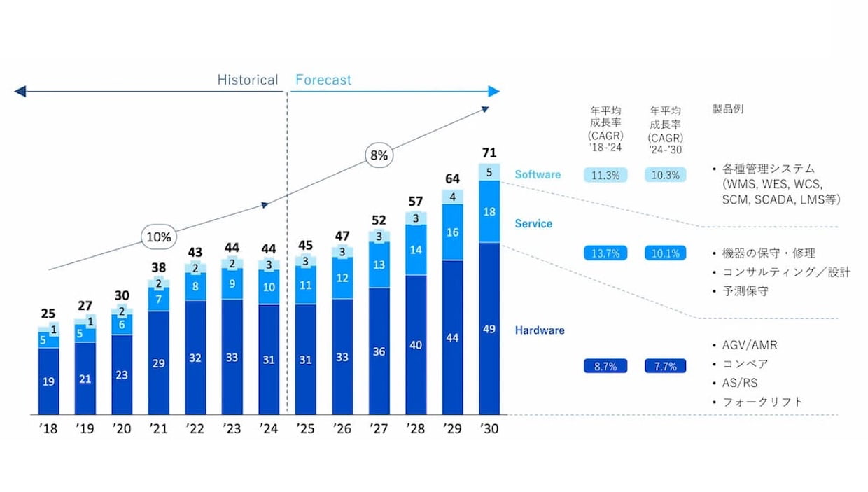レポートによると、フォークリフトやコンベヤー、無人搬送車(AGV)、自律走行搬送ロボット(AMR)を中心に、サービスやソフトウエアを含む世界のマテハン機器市場は、EC(電子商取引)市場の拡大に伴い順調な市場成長を遂げており、2024年には440億ドルの市場規模にまで拡大した。今後、年平均10.3%の成長率が見込まれ、30年には710億ドル規模に達すると見込まれる。