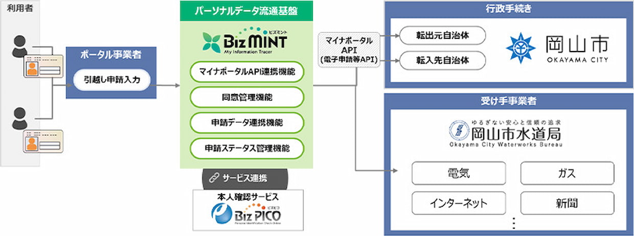 岡山市でも「BizMINT引越」を利用し、マイナカードがあれば、転出入手続きのほか、電気、水道、ガス、新聞、インターネットなどの住所変更や新規申し込みなどができるシステムの構築を目指す。