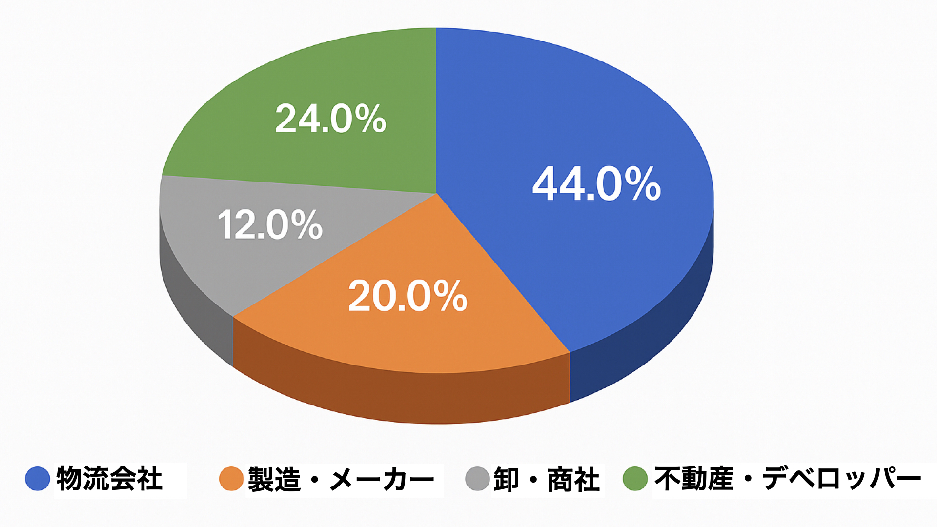 三和建設の強みは、特定の業種に偏らず、多様なクライアントの要望に応えられる柔軟性にもある。同社の危険物倉庫発注者の内訳を見ると、物流会社(44%)に加え、製造・メーカー(20%)、卸・商社(12%)、そして不動産デベロッパー(24%)と、幅広いプレイヤーが名を連ねていることが分かる。「一口に危険物倉庫と言っても、お客様の業種によって求められるものは大きく異なる」と松本氏は語る。