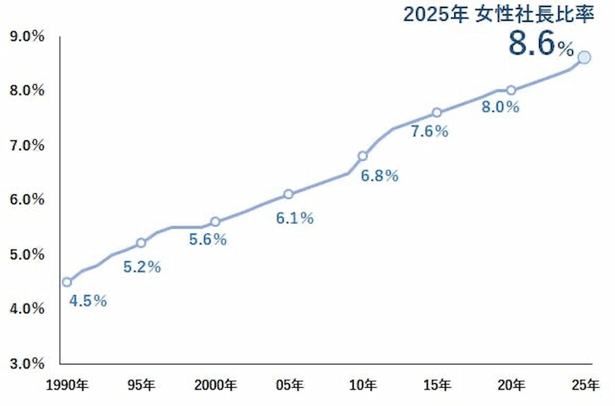 女性社長の比率は調査を開始した1990年は4.55%で、毎年上昇を続けているが、依然として1割以下にとどまっている。