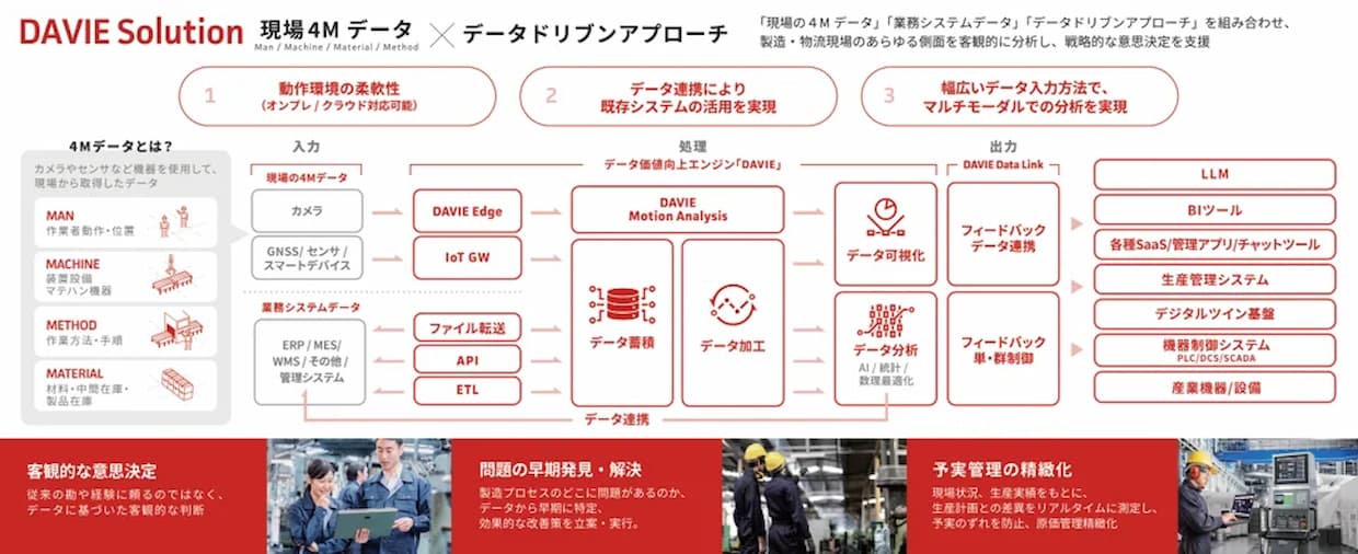 製造・物流業界では人手不足や高齢化、生産性向上の要請が強まっている。DAVIE MAは、現場の勘や経験に依存した運営から脱却し、人・モノの動きを定量データとして扱うことで、安全確保やムリ・ムダ・ムラの排除に寄与する。