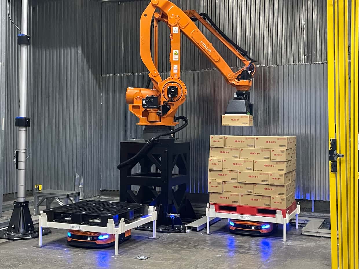 ▲冷蔵エリアで検証されるアームロボットとAGVの連携